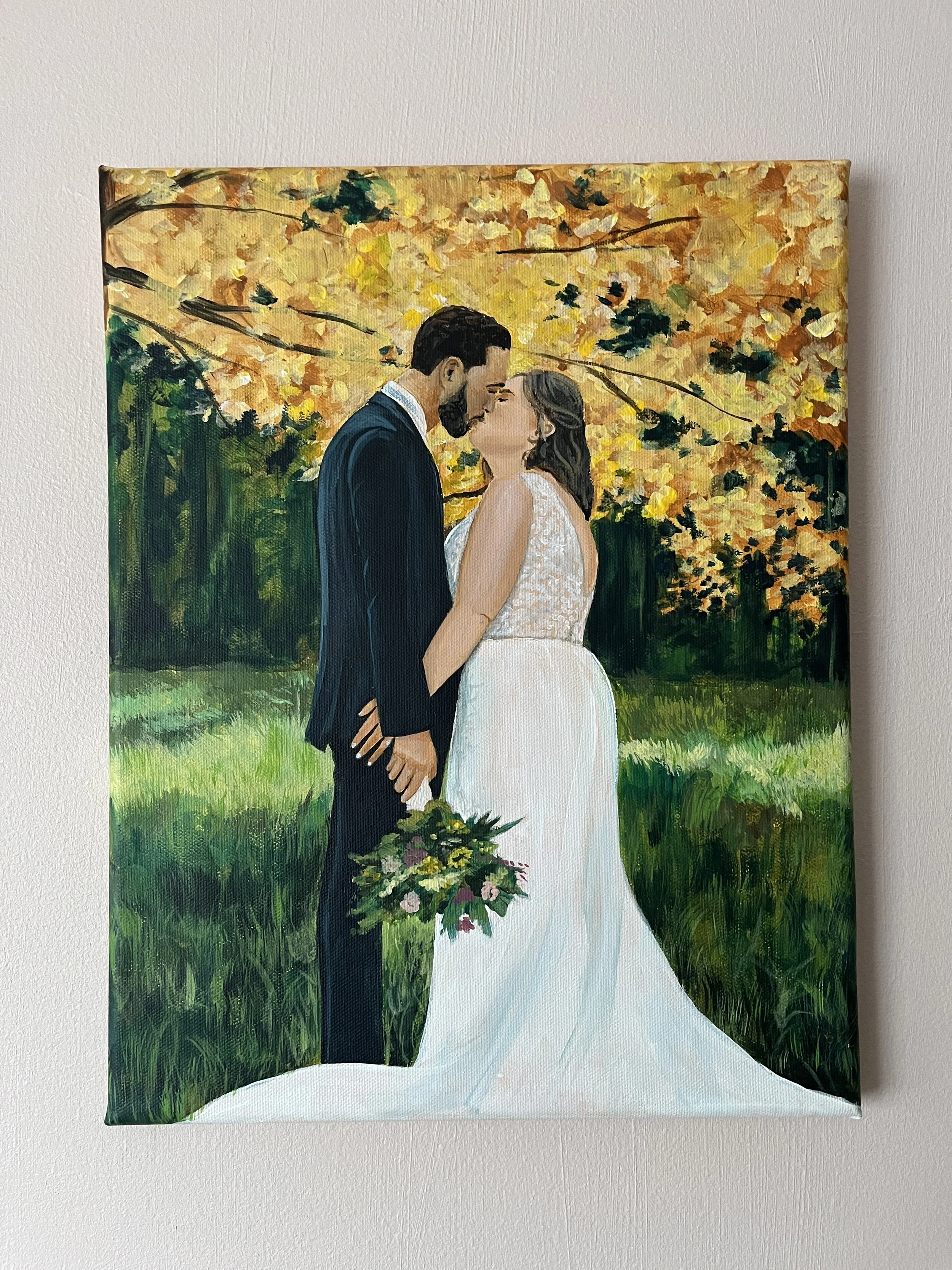 After your initial inquiry, I will get back to you with my canvas size and pricing options. Investment starts at $1000. Additionally, I will let you know if I am available for your date. When we are a bit closer to your event, A zoom or phone call will be scheduled to discuss the specifics of your painting. Due to time constraints, I am only able to paint 2 people per wedding painting. (Sorry uncle Tony!!)